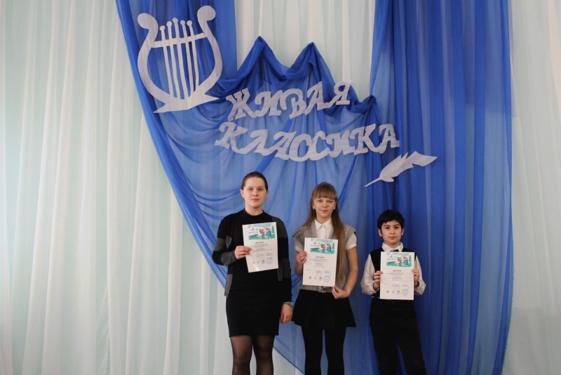 13 марта на базе Дома Детского творчества прошел районный этап конкурса юных чтецов "Живая классика". От нашей школы приняли участие победители школьного этапа конкурса "Живая классика" - Шихмагомедов Тимур, Толкачева Диана и Тифантьева Феона. Огромная благодарность учителям русского языка и литературы Штурминой М.Н. и Филатовой Т.А. за подготовку участников к конкурсу.