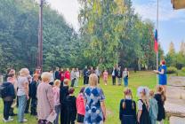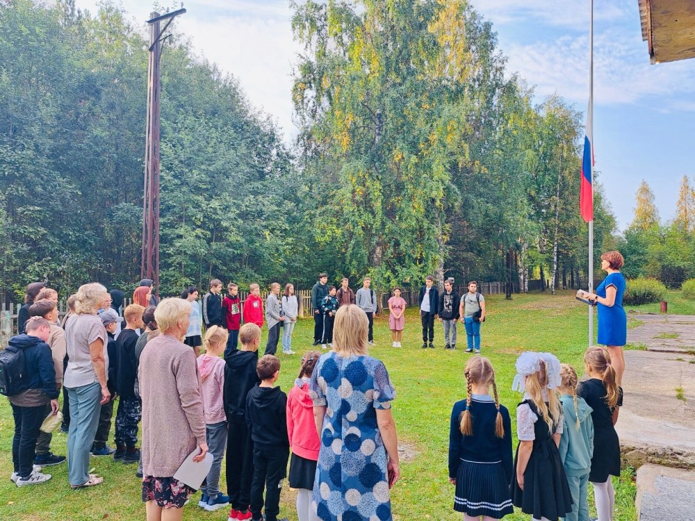 Линейка началась с поднятия флага РФ. Право поднять государственный флаг РФ было предоставлено ученику 8 класса Медведеву Кириллу. Все учащиеся и учителя исполнили Гимн РФ.